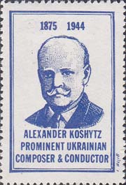 1980(?) г. Разм. 25 х 39 мм. Одноцветная печать на белой бумаге. Зубц. 12 1/2. С клеем. В центре в прямоугольной рамке портрет А.А. Кошица. Сверху даты: "1875 - 1944". Внизу текст в три строки на английском языке: "Александр Кошиц. Известный украинский композитор и дирижер".