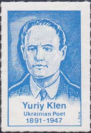 1980(?) г. Разм. рамки 25,5 х 49 мм. Одноцветная печать на белой мелованной бумаге. В центре портрет Ю. Клена. Внизу текст на английском языке в три строки: "Юрий Клен. Украинский поэт. 1891 - 1947"