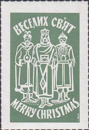 1980(?) г. Разм. рис. 24 х 38 мм. Одноцветная печать на белой мелованной бумаге. Линейная просечка. С клеем. В центре изображения исторических деятелей. Текст на украинском и английском языках: "Счастливого Рождества".