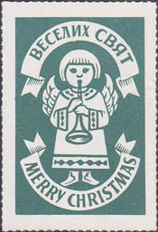 1980(?) г. Разм. 23,5 х 35 мм. Одноцветная печать на белой мелованной бумаге. Линейная просечка. В прямоугольной рамке в центре ангелы. Текст на украинском и английском языках: "Счастливого Рождества".