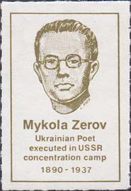 1980(?) г. Разм. рамки 26 х 40 мм. Одноцветная печать на белой мелованной бумаге. Линейная просечка. В прямоугольной рамке портрет М. Зерова. Внизу текст в пять строк на английском языке.