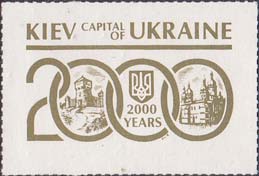 1980(?) г. Разм. по просечке 44 х 30 мм. Одноцветная печать на белой мелованной бумаге. В центре виды Киева. Текст на английском языке: "Киев - столица Украины 2000 лет".