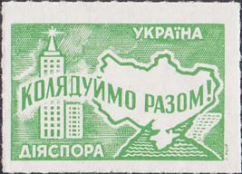 1980(?) г. Разм. рис. 40 х 25,5 мм. Одноцветная печать на белой глянцевой бумаге. Линейная просечка. С клеем. Небоскреб и карта Украины. Текст в три строки на украинском языке: "Украина Диаспора колядуем вместе!"