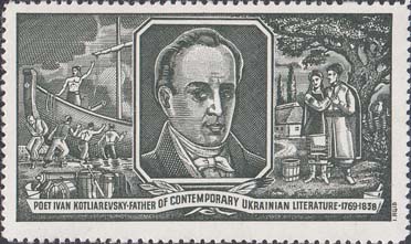 1980(?) г. Разм. рис. 58 х 32 Одноцветная печать на белой мелованной бумаге. Зубц. 12 1/2. С клеем. В центре портрет И. Котляревского. Слева и справа сцены из его произведений. Внизу текст на английском языке.